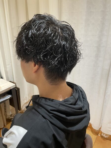 しっかりカールをつけるパーマではなく、あくまで「クセ毛のようなゆるい動き」を作るのがポイント。