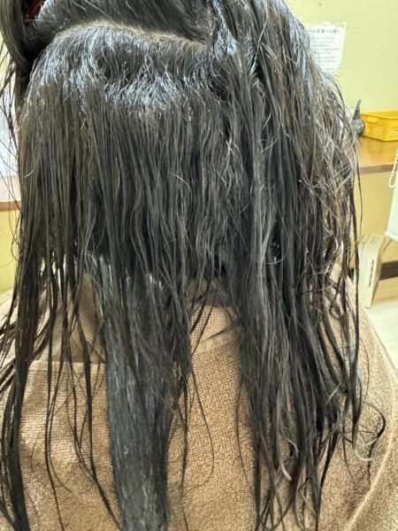 このお客様は、クセの戻りが早いわけではないのですが、生活の中で扱いやすい状態を保つために、3ヶ月に一度のペースで縮毛矯正をかけています。細い髪だからこそ負担は最小限に、でも強いクセはきちんと伸ばしてあげることが大切なんです。