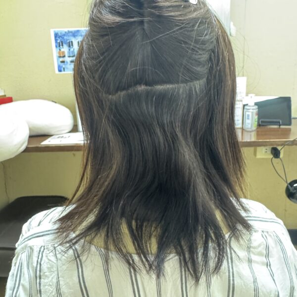 今回のお客様は、長さのあるミディアムスタイルで、全体的にうねりと広がりが出やすい髪質の方。