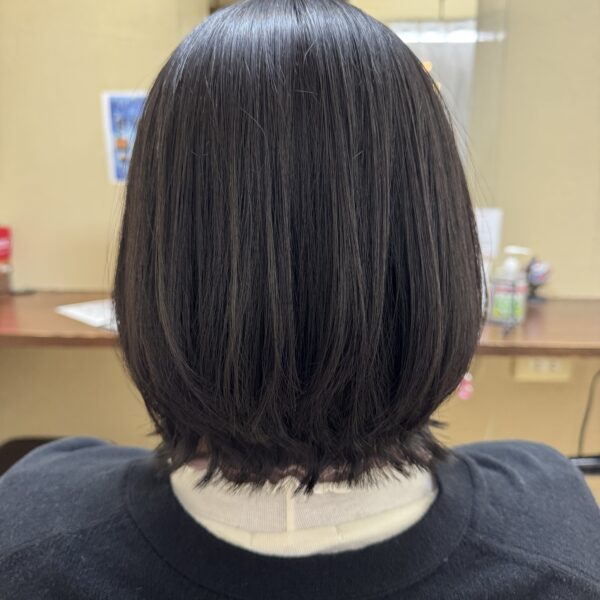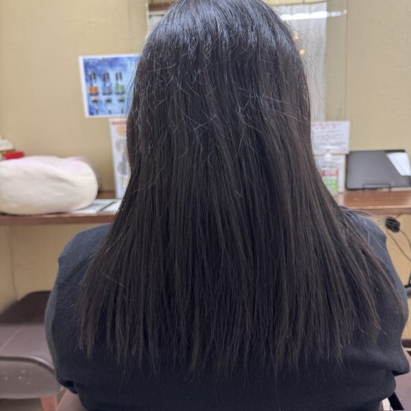 施術後は、根元から毛先までなめらかで、ツヤのあるストレートに。ピンと張り付くような不自然さはなく、やわらかく女性らしい質感に仕上がりました。