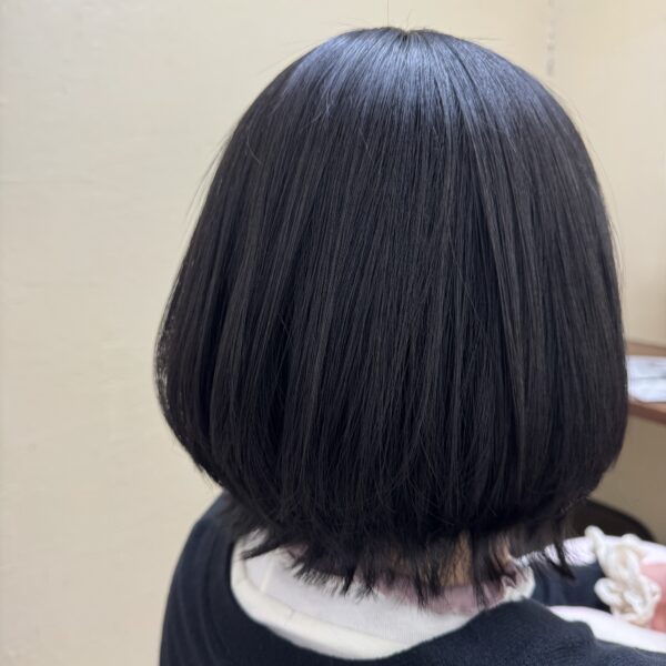 そして今回は、縮毛矯正をかけたタイミングでロングヘアからバッサリと肩上までカット。長さを変えることで、全体がすっきりと軽くなり、ストレートの美しさがより引き立つスタイルに。まとまりが良くなったことで、毎日のスタイリングもとても楽になります。