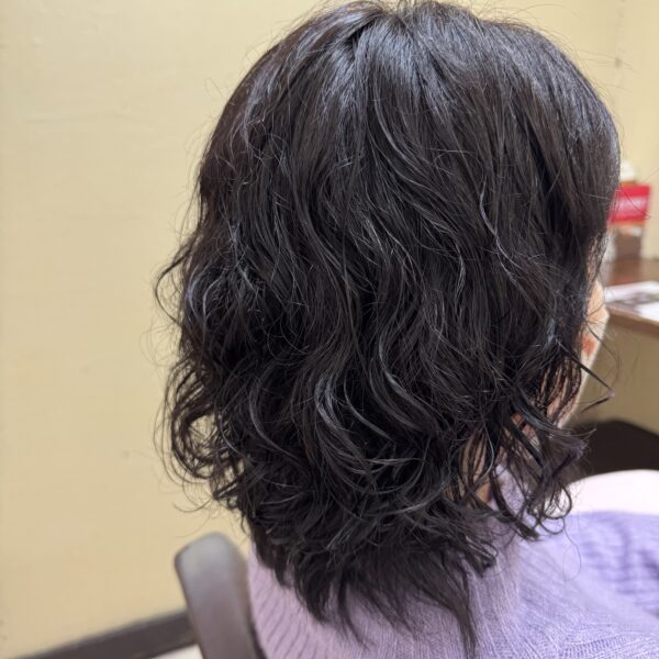 今回は、しっかりカール感はありつつも、やりすぎないやわらかな雰囲気になるように、薬剤やロッドの大きさを調整しました。もともとのくせと重なって、ナチュラルで大人っぽい、やさしいウェーブに仕上がっています。