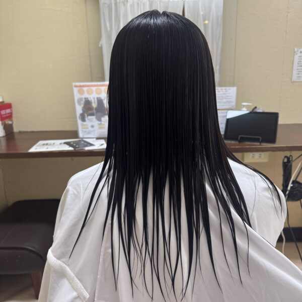今回ご来店いただいたお客様は、髪のうねりや広がりが気になり、まとまりにくいことがお悩みでした。朝きれいに整えても時間が経つと広がってしまったり、湿気の多い日は特に扱いづらく感じるとのこと。そこで今回は、髪への負担をできるだけ抑えながら自然にクセを整える、ノンアルカリ・ノンシリコンの縮毛矯正をさせていただきました。