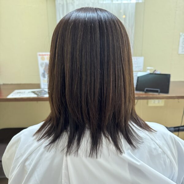 仕上がりは、クセがきれいに伸びて指通りもなめらかに。ノンシリコンの薬剤なので、コーティングに頼りすぎない自然なツヤが出て、とてもやわらかい質感のストレートヘアになりました。光が当たるとツヤっとした自然な輝きが出て、とてもきれいです。