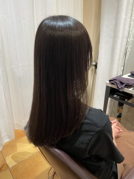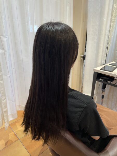 必要以上に真っ直ぐにしすぎず、髪の状態を見ながら薬剤やアイロン操作を調整しているので、硬くなりすぎない仕上がりになっています。