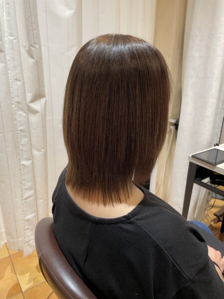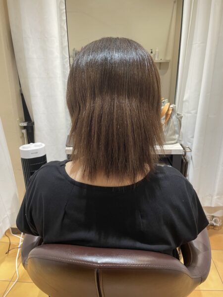 施術後の髪は、写真からも分かるように根元のふくらみがしっかり収まり、全体のシルエットがすっきりと整いました。