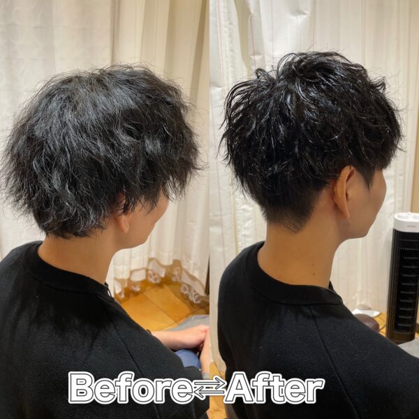 Beforeの状態は、数ヶ月前にかけたパーマが伸びてきて、全体的に広がりやすくなっている髪。